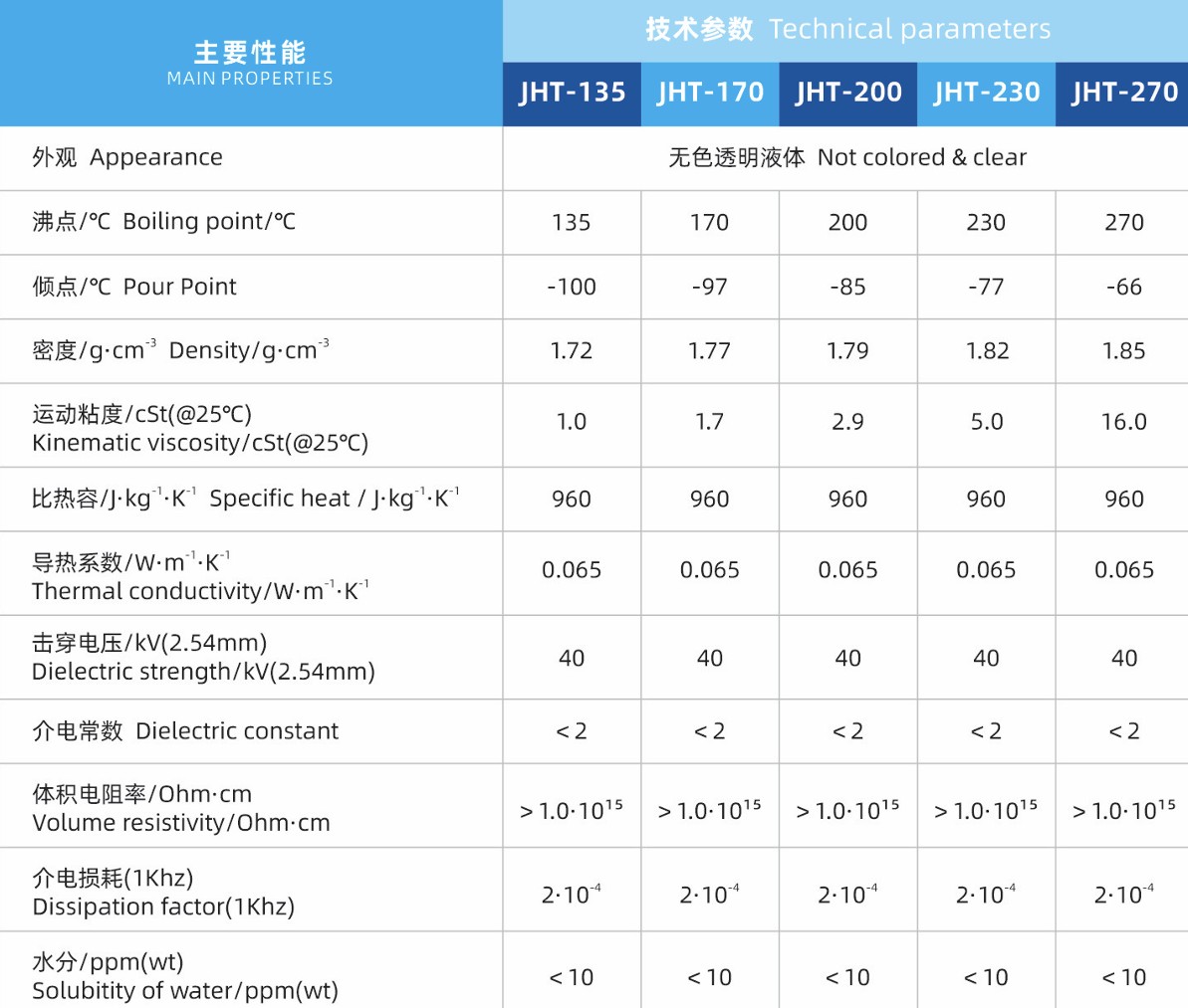 JHT系列是一款新型全氟聚醚產品,具有優異的耐化學性,熱阻性和介電性能,無毒性,無閃點,無燃點,低黏度等特性,是新一代熱傳導流體
